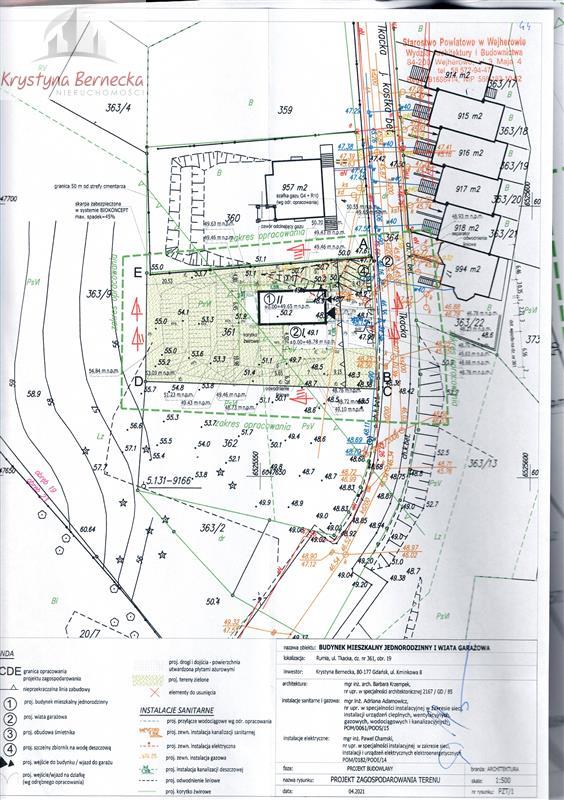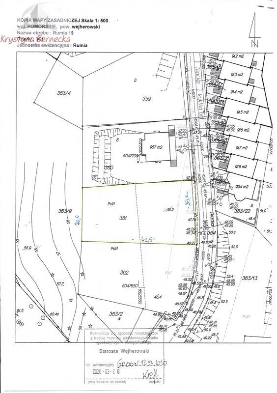 SPRZEDAM działkę budowlaną w Rumi Zagórze ul. Tkacka z wydanym pozwoleniem na budowę. Działka budowlana o nieregularnym kształcie pow. 939 m2. ( wymiary działki 20 x 42,5 x 25 x 42,5 m)